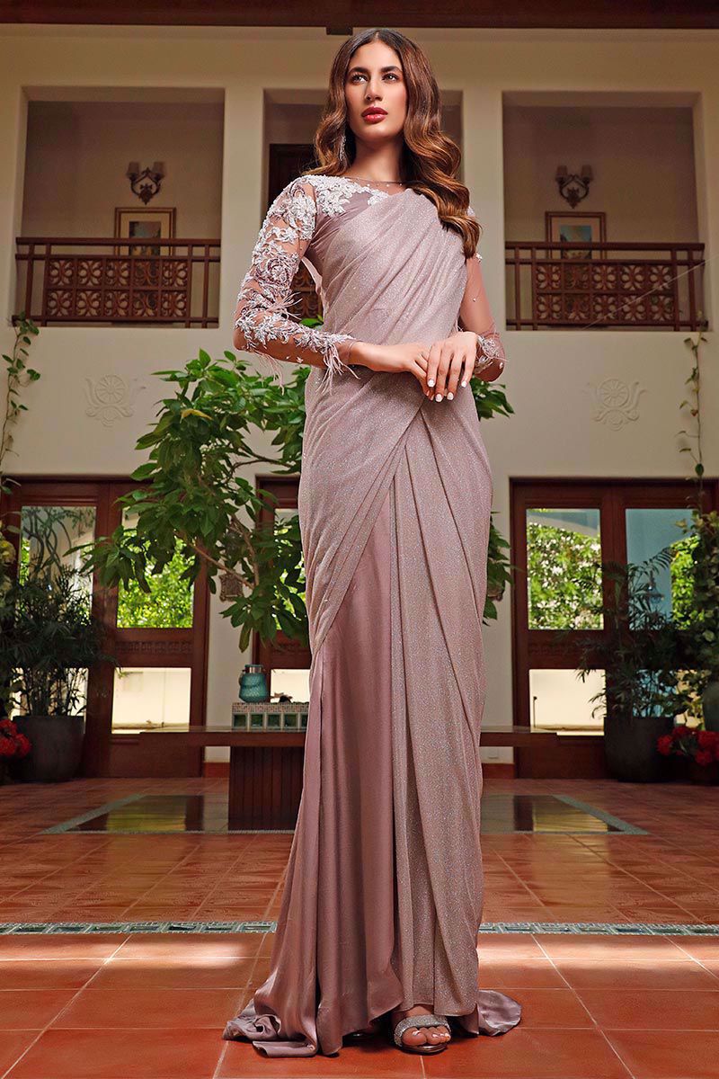 A sophisticated Lilac color comprising of pure georgette and moonlight fabric. The bodice is incorporated with sheer net in yoke and sleeves with adornments of pearls, stones, resham, kora, dabka and feathers.