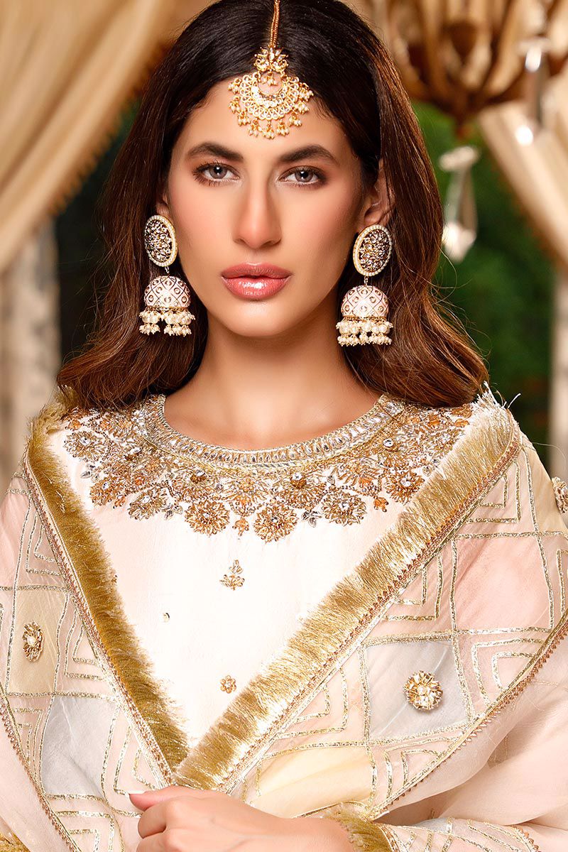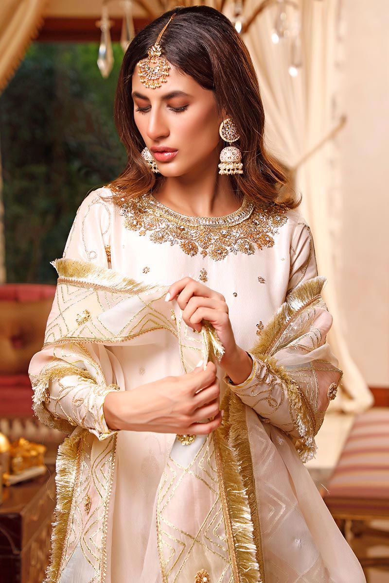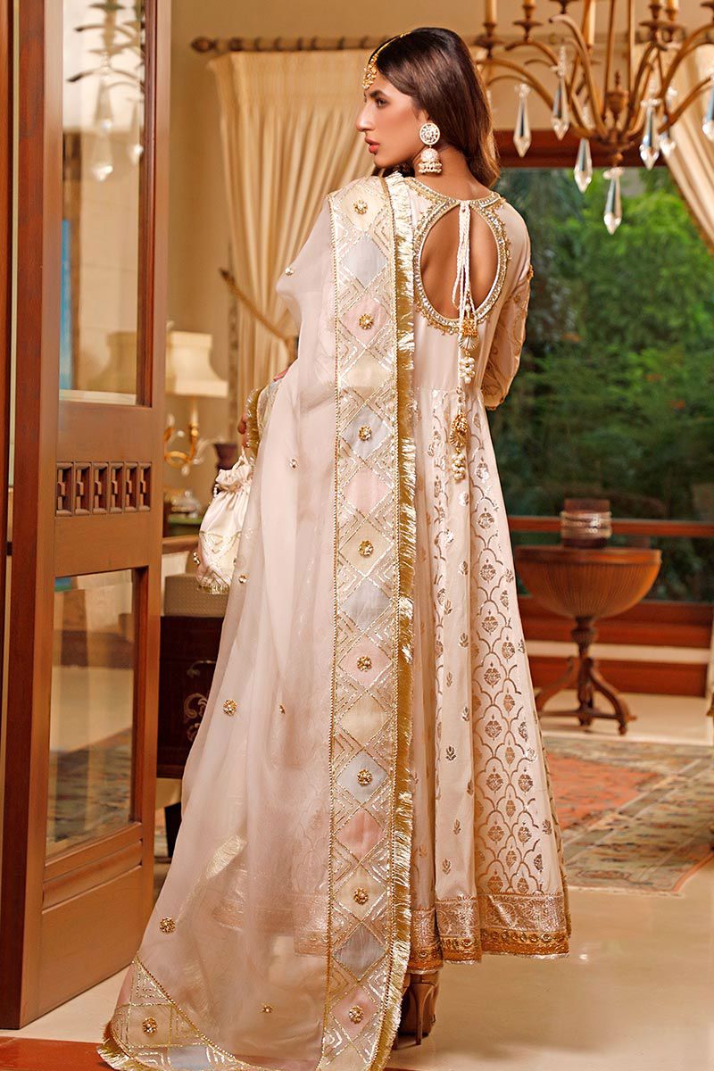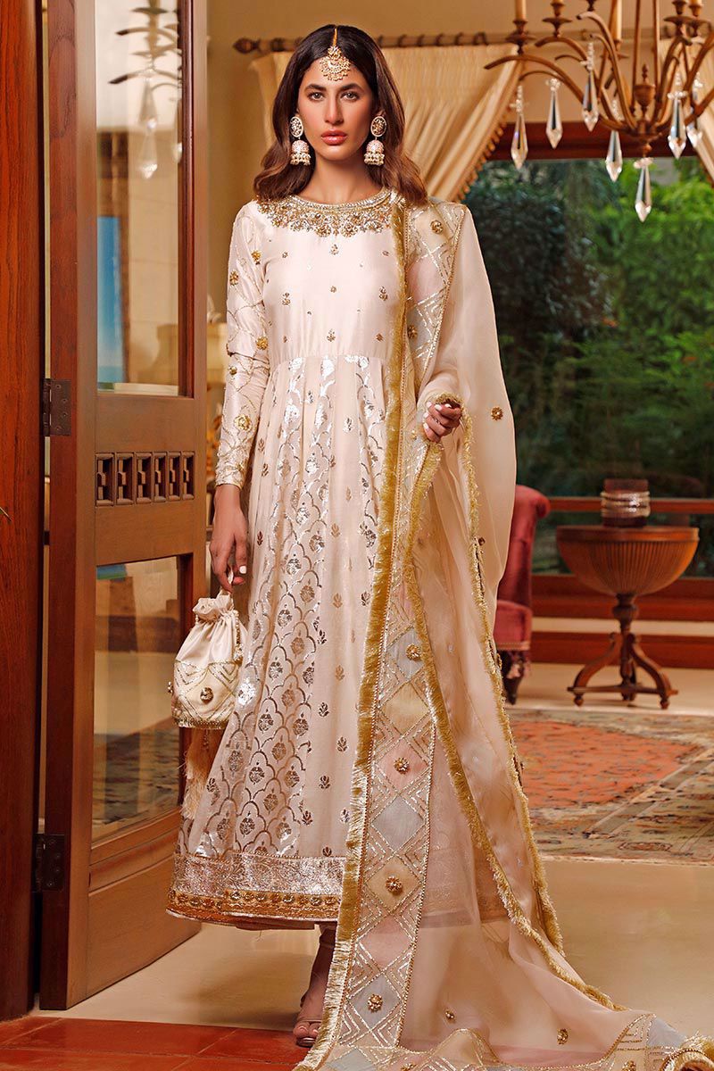 Undistinguishingly classic Ivory peshwas embraces of ancestral handwork of dabka, nakshi and gota on the bodice and sleeves. Attached with golden and white lorex panels, finishing the hem with bespoke lace. The look is magnified with pastel color border patches on ivory organza dupatta. Same color semi pure churidar pajama also included.