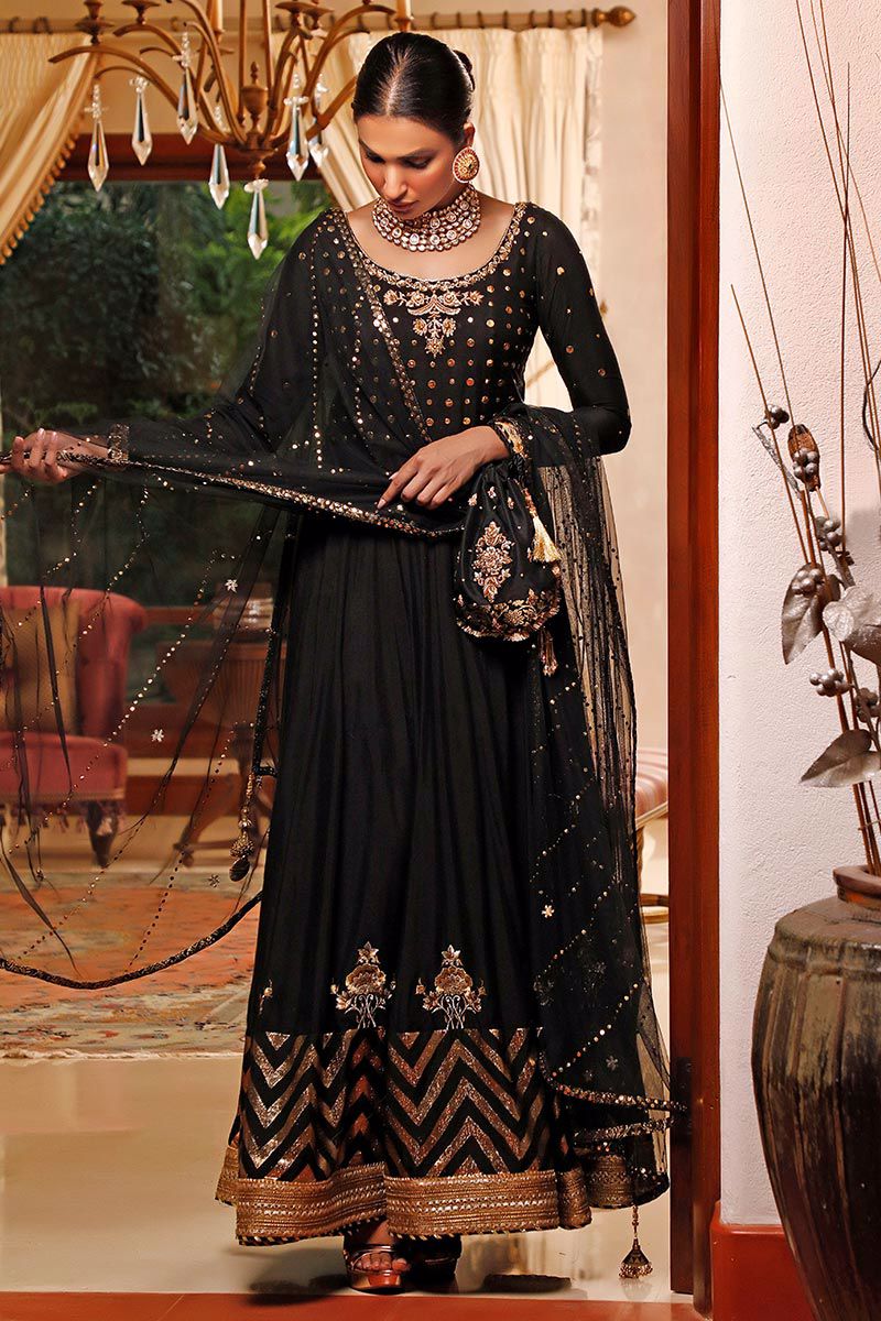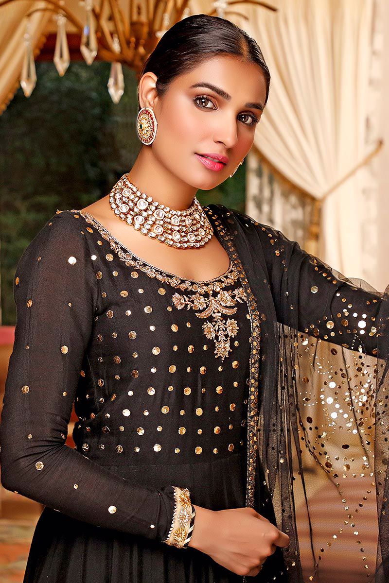 Detailed traditional orientation shown on black khaadi peshwas with intricate handwork of kamdani, zardozi, kora, dabka and nakshi on the bodice. Along with lorex and machine embroidery enhancing the flair panels. Polishing off the eastern look with a churidar pajama and net kamdani dupatta.