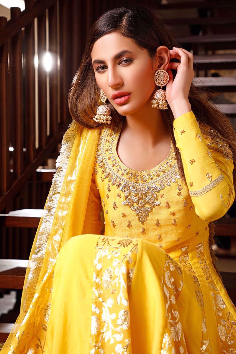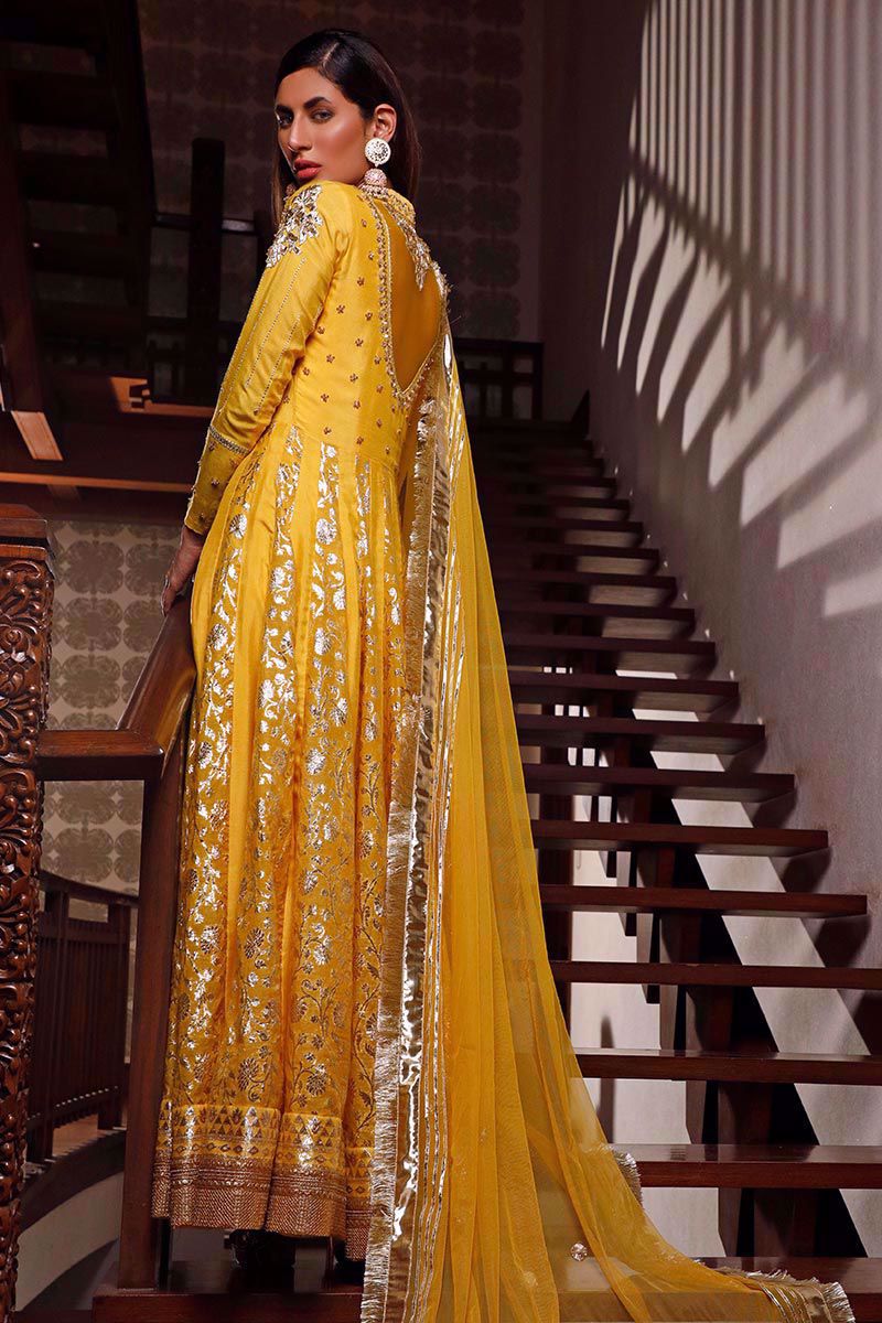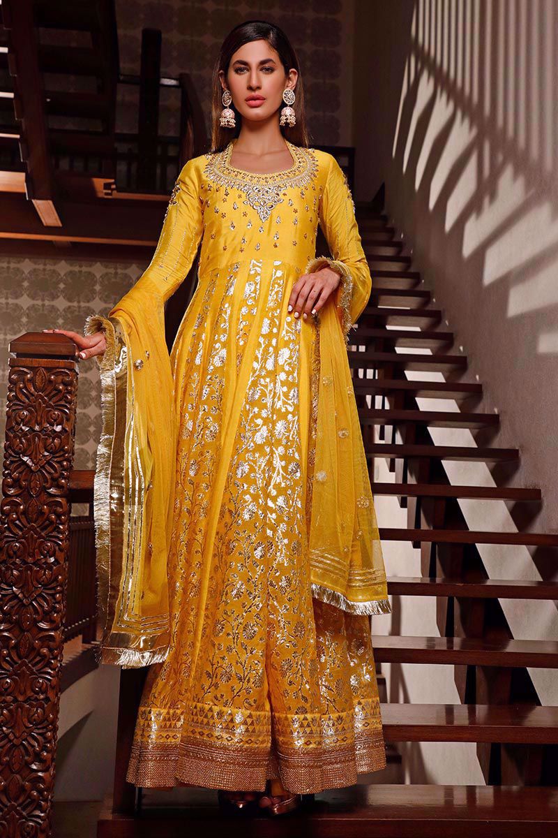 A classic pure khaadi marigold yellow peshwas, comprising of superior quality gota handwork mixed with cut dana crystals, sequins and machine embroidery. The flair panels joining from the waist unite with same color lorex. Finishing off the hem with mesmerizing sequins gota. Paired with same color semi pure churidar pajama and net dupatta.