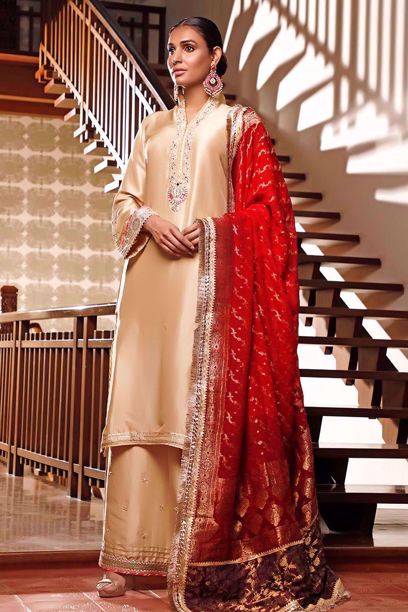 True craftsmanship is seen in Beige pure raw silk long shirt.  Sterling gota, resham and mirror work around the neckline enriches the front and sleeves. Same color pure raw silk izaar is paired as addons. Bringing richness to the outfit, shaded red banarsi dupatta can be purchased at additional cost.