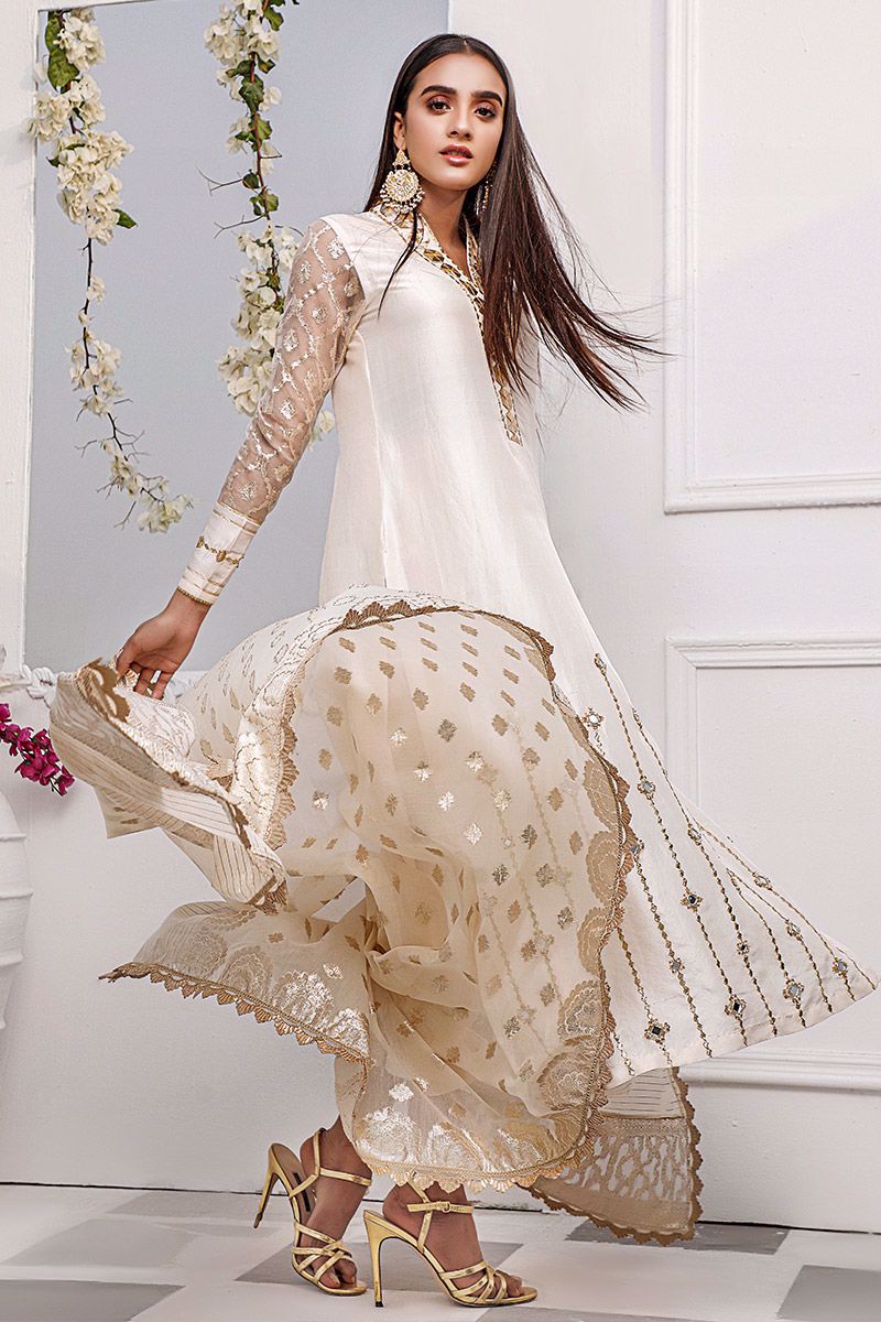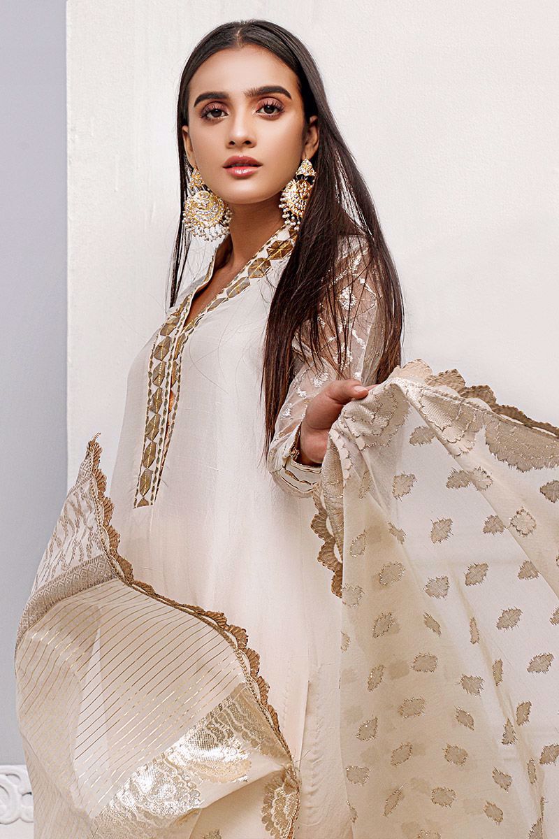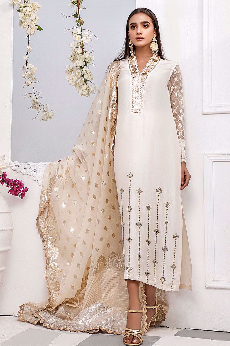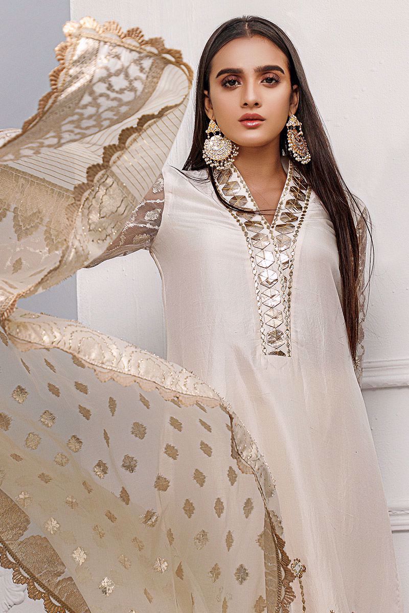 New dimension of elegance shown in the ivory pure raw silk kurta. The bold high neckline compliments best with hexogen and dainty diamond gota. Details continue in alignment towards the hemline which comprises of mirror, cutdana, pearl and sequin. The look is further uplifted by embellished sleeves including the cuff. Attire is finalized along side same color pure raw silk embellished pants and lorex dupatta with gold work finishing which is to be purchase at additional cost.