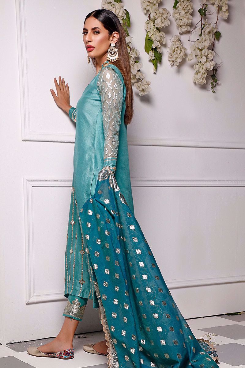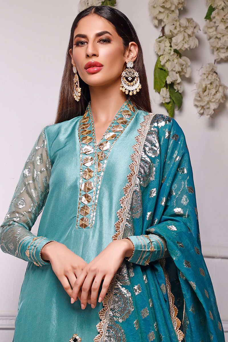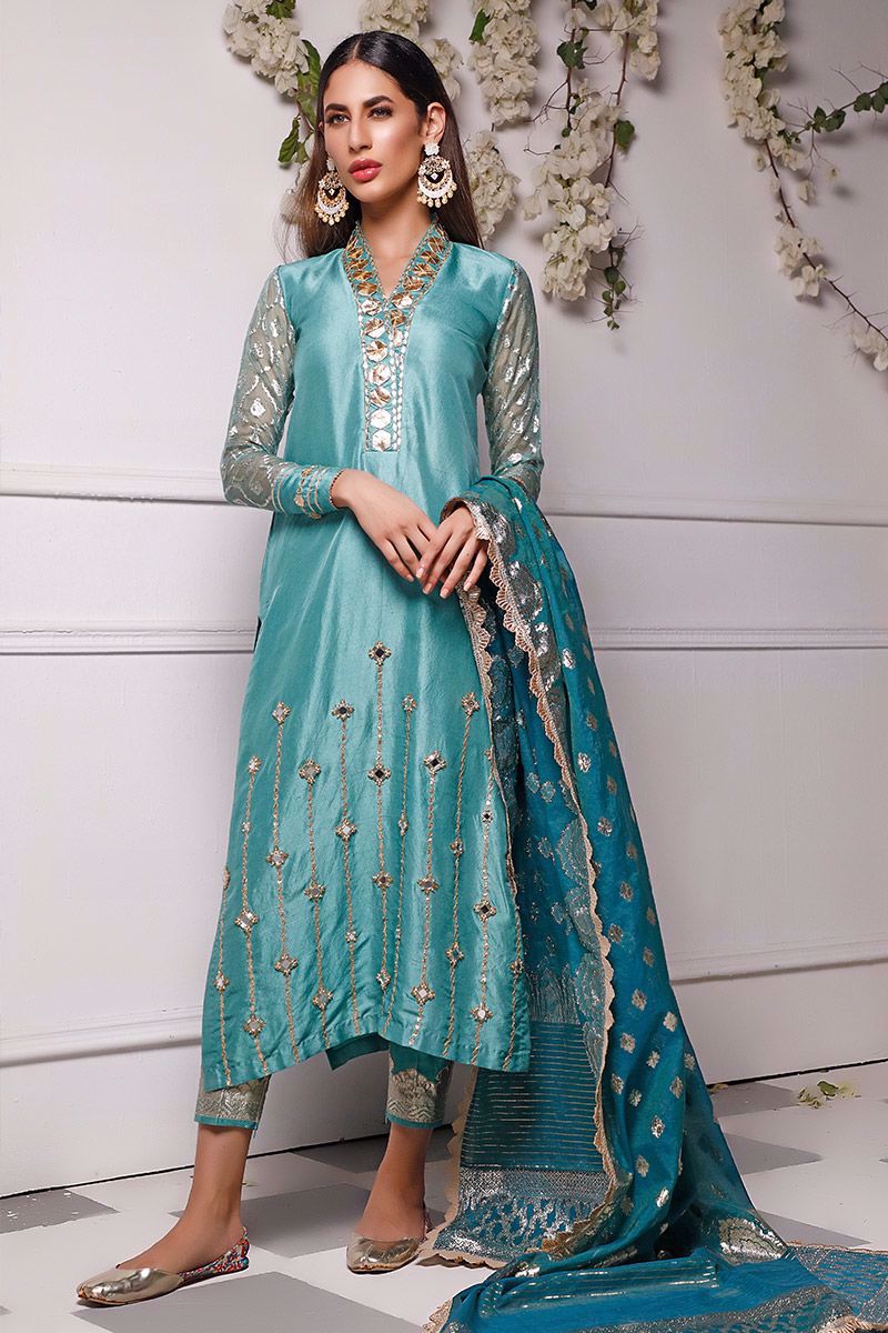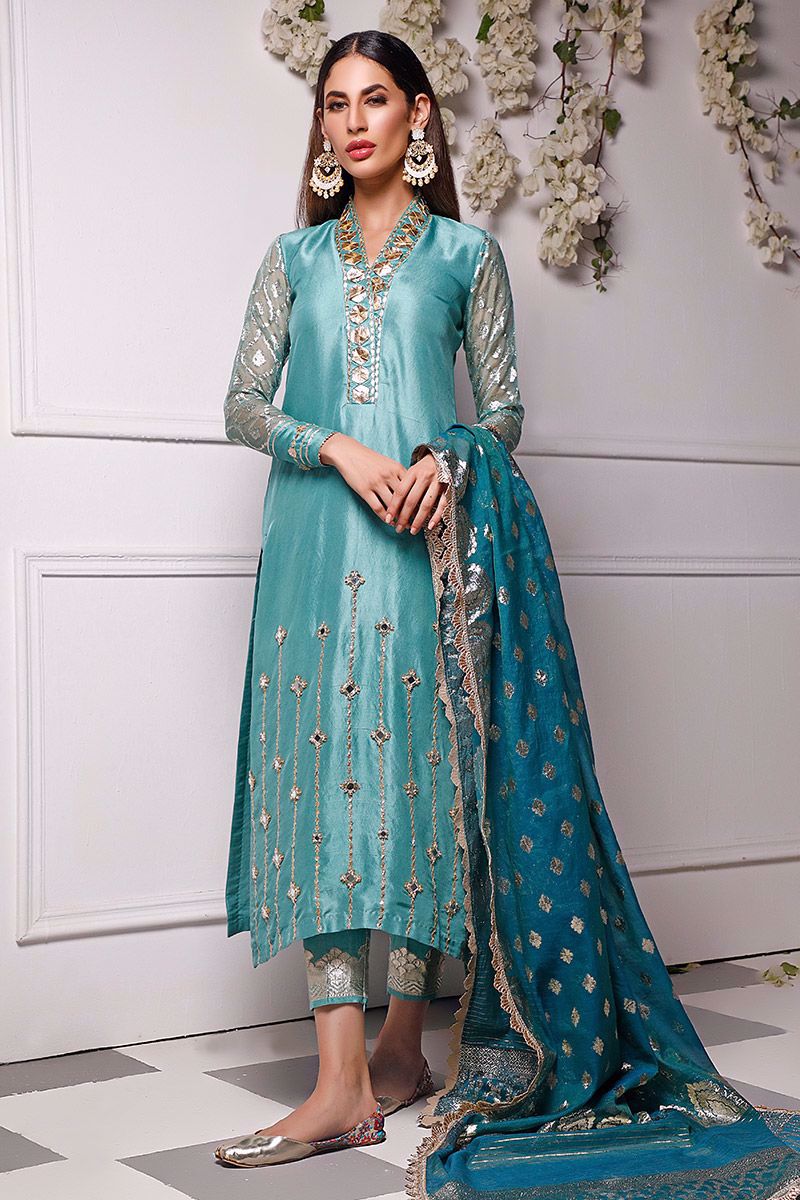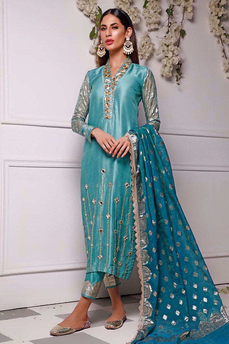 New dimension of elegance shown in the marine green pure raw silk kurta. The bold high neckline compliments best with hexogen and dainty diamond gota. Details continue in alignment towards the hemline which comprises of mirror, cutdana, pearl and sequin. The look is further uplifted by embellished sleeves including the cuff. Attire is finalized along side same color pure raw silk embellished pants and lorex dupatta with gold work finishing which is to be purchase at additional cost.