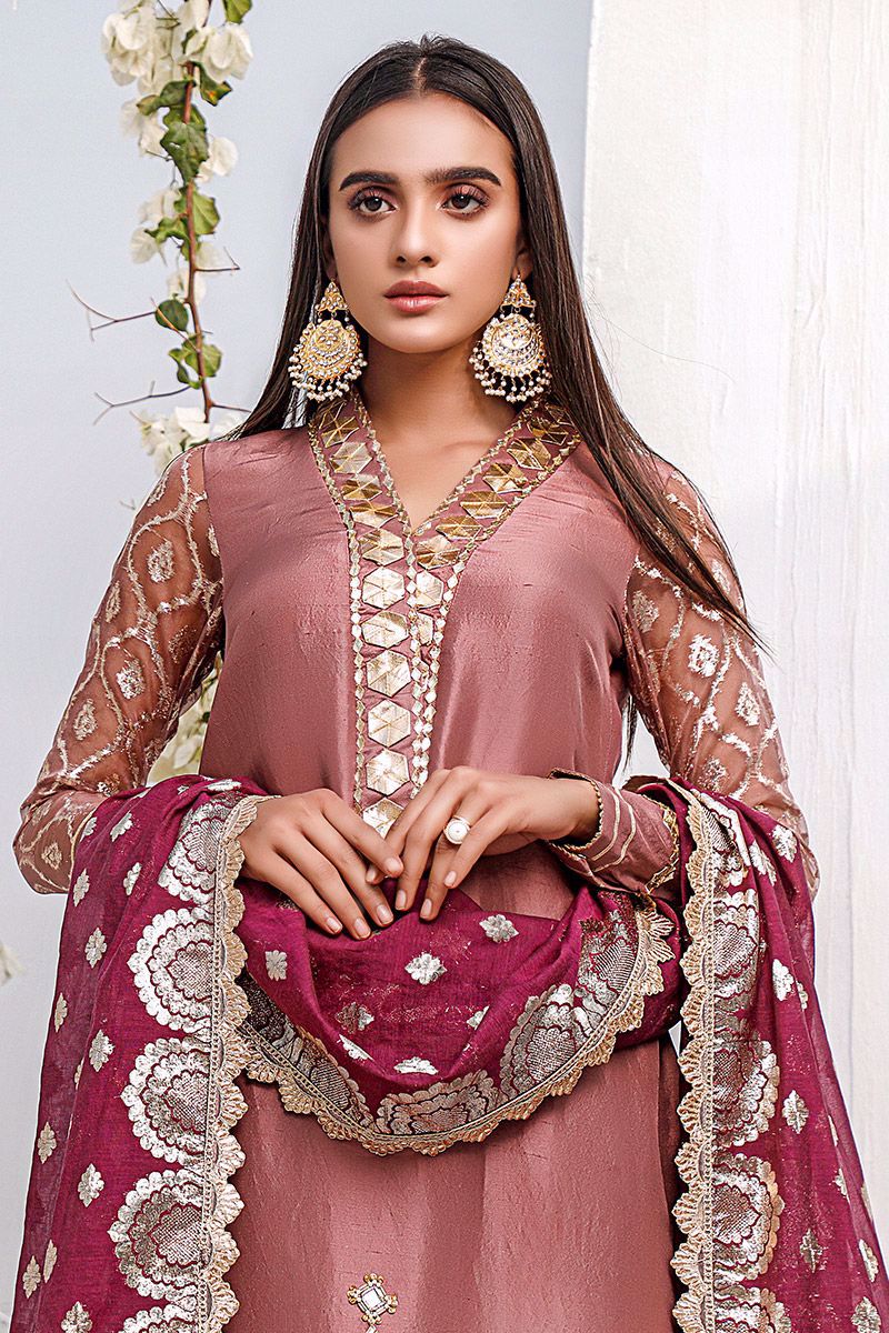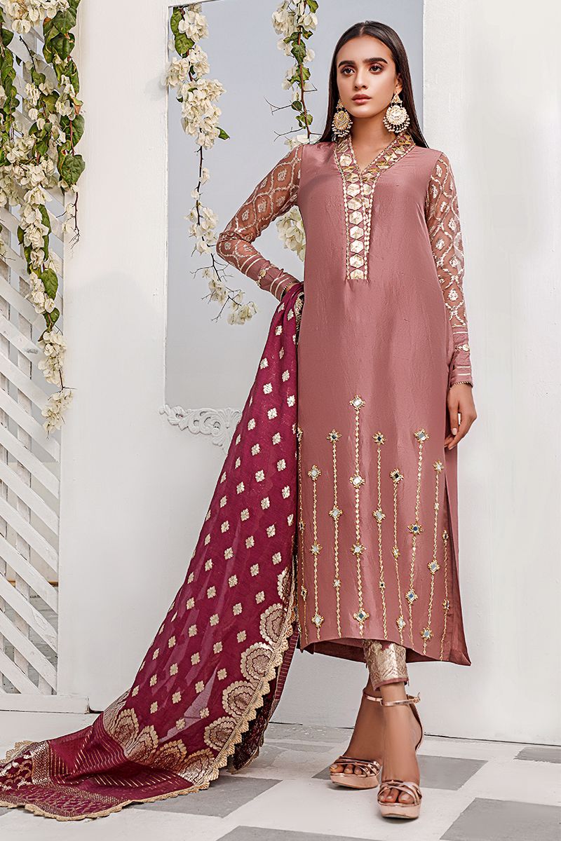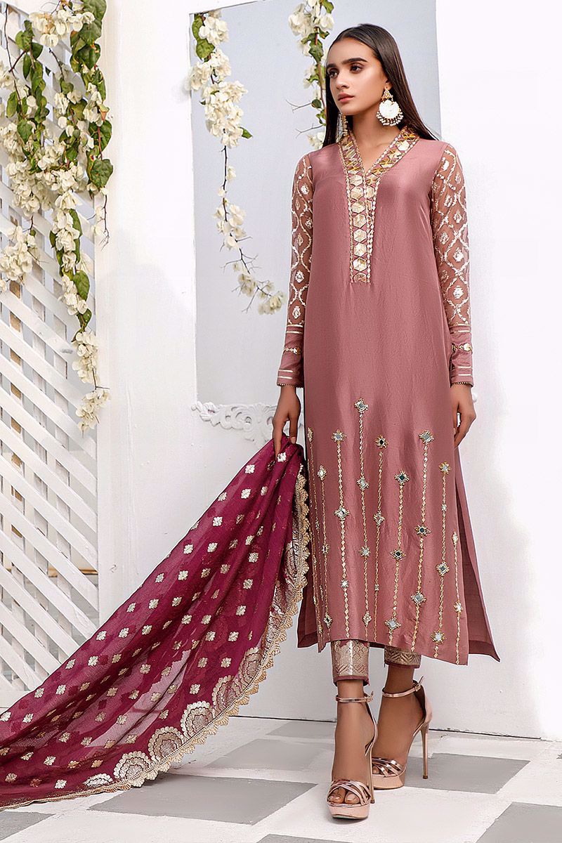 New dimension of elegance shown in the nude pink pure raw silk kurta. The bold high neckline compliments best with hexogen and dainty diamond gota. Details continue in alignment towards the hemline which comprises of mirror, cutdana, pearl and sequin. The look is further uplifted by embellished sleeves including the cuff. Attire is finalized along side same color pure raw silk embellished pants and lorex dupatta with gold work finishing which is to be purchase at additional cost.