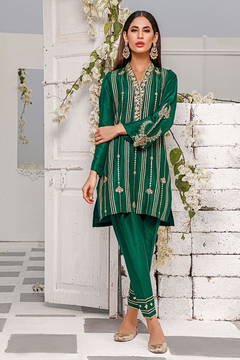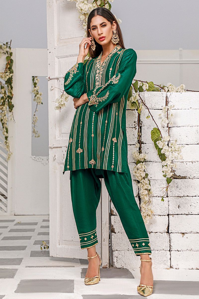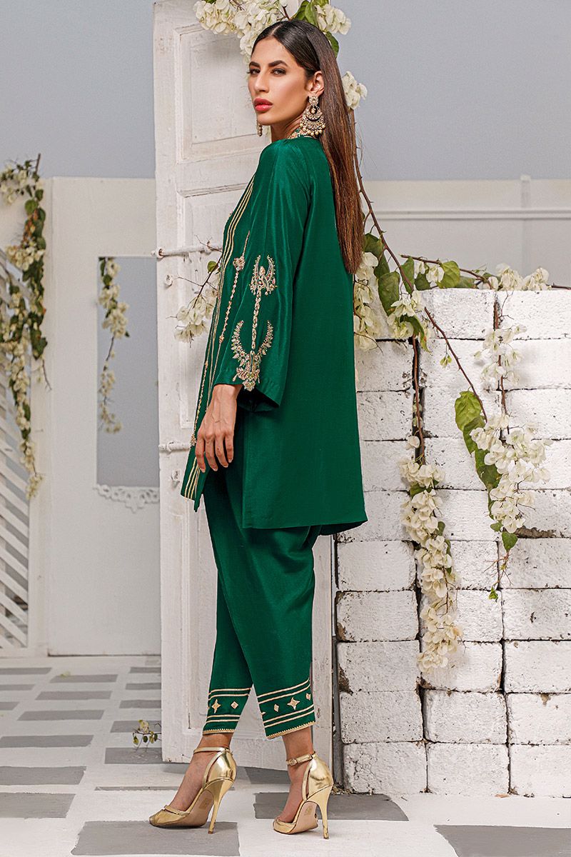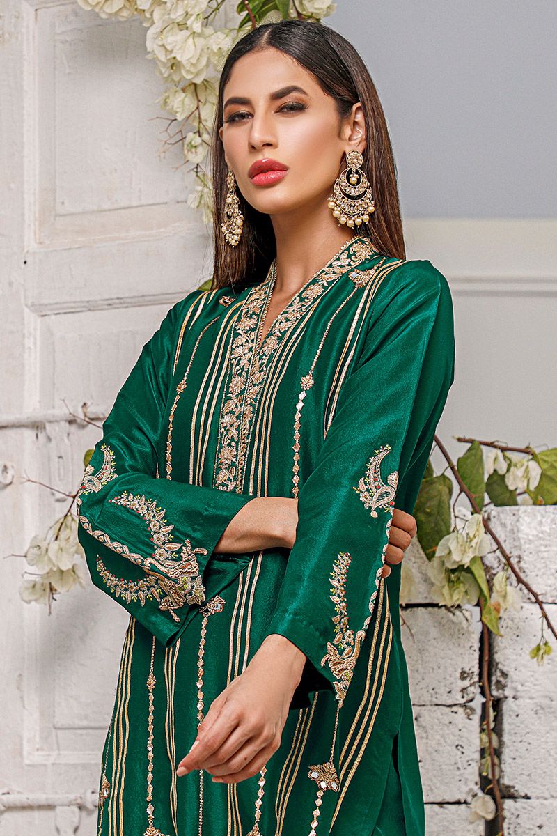 Reviving the ancestral customs, bottle green pure raw silk kurta is assembled with intricate needlework comprising of gota, zardozi, mirror and sequin. The blossoming florals portrays a bold statement complementing with the fauna representation on the sleeves. Same color pure raw silk skinny shalwar is paired to finish off the look and can be purchased at additional cost.