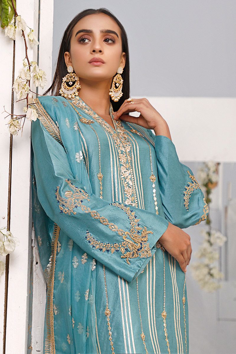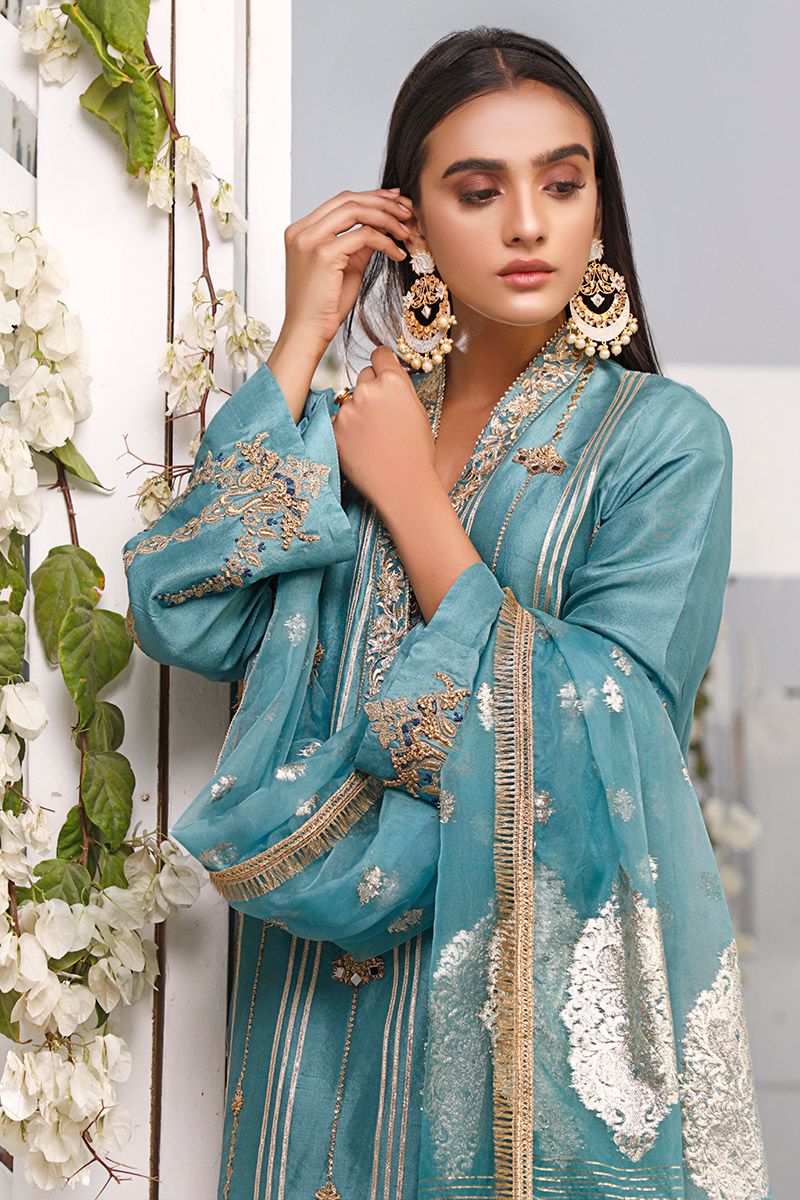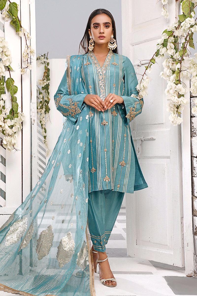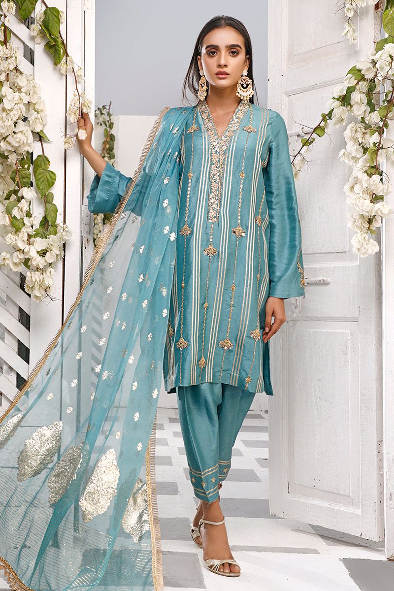 Reviving the ancestral customs, marine blue pure raw silk kurta is assembled with intricate needlework comprising of gota, zardozi, mirror and sequin. The blossoming florals portrays a bold statement complementing with the fauna representation on the sleeves. Same color pure raw silk skinny shalwar and shaded organza dupatta is paired to finish off the look. Both can be purchased at additional cost.