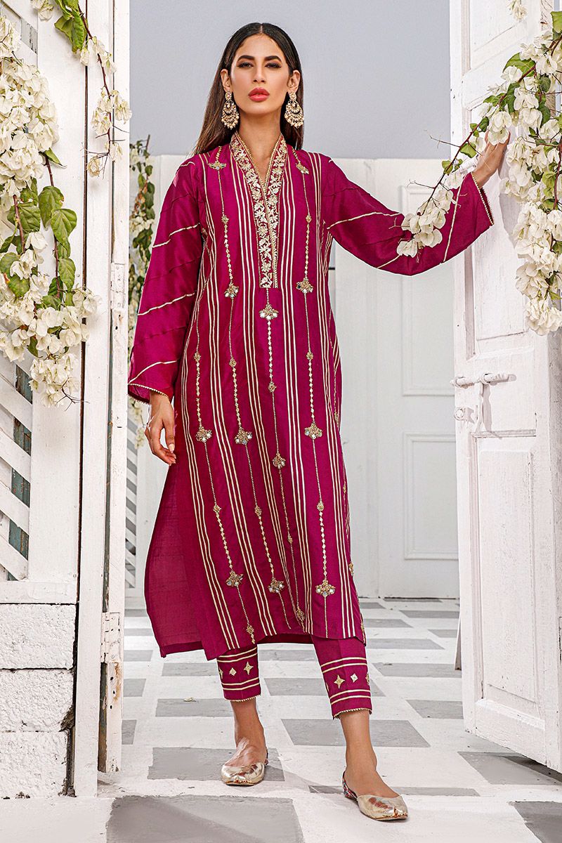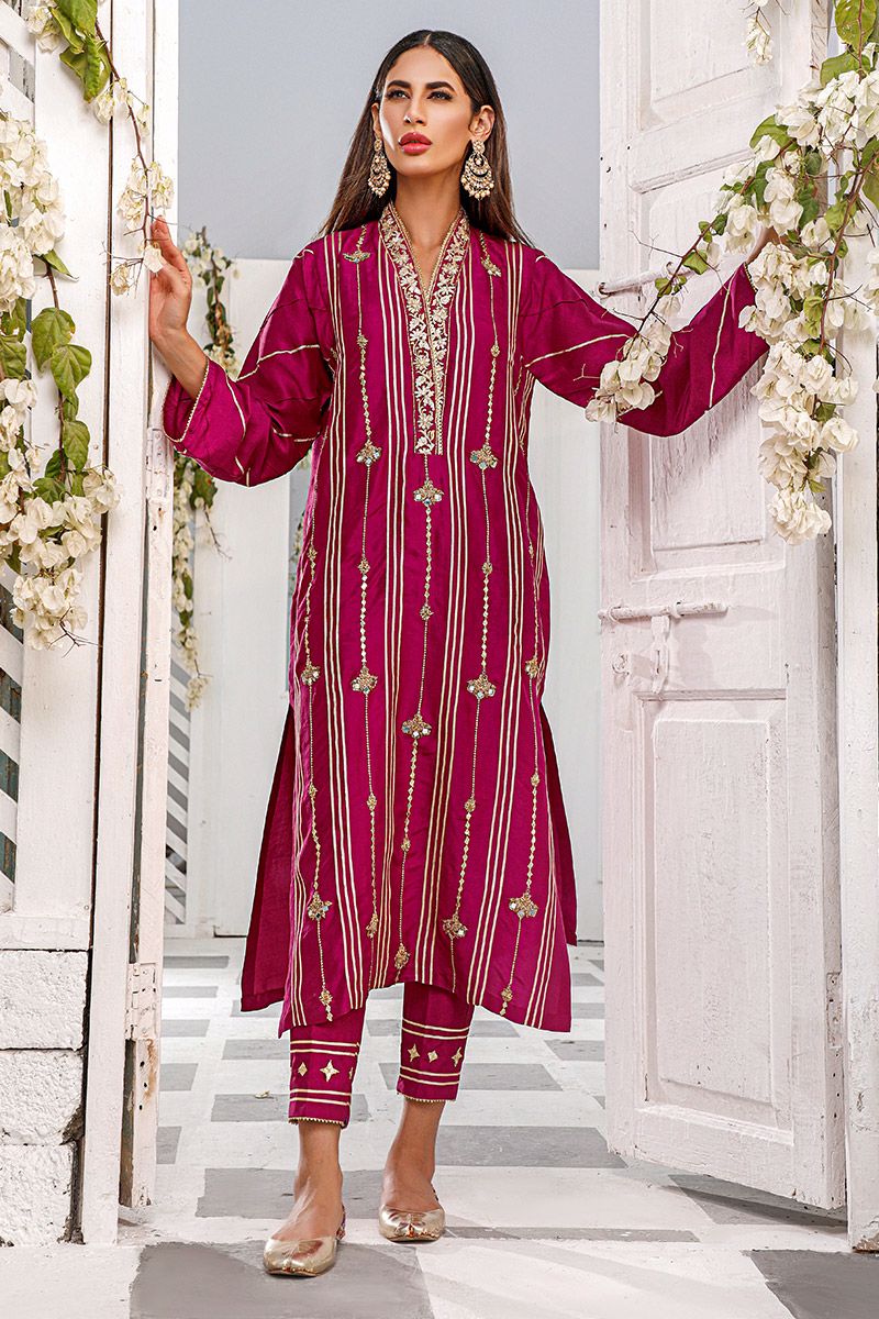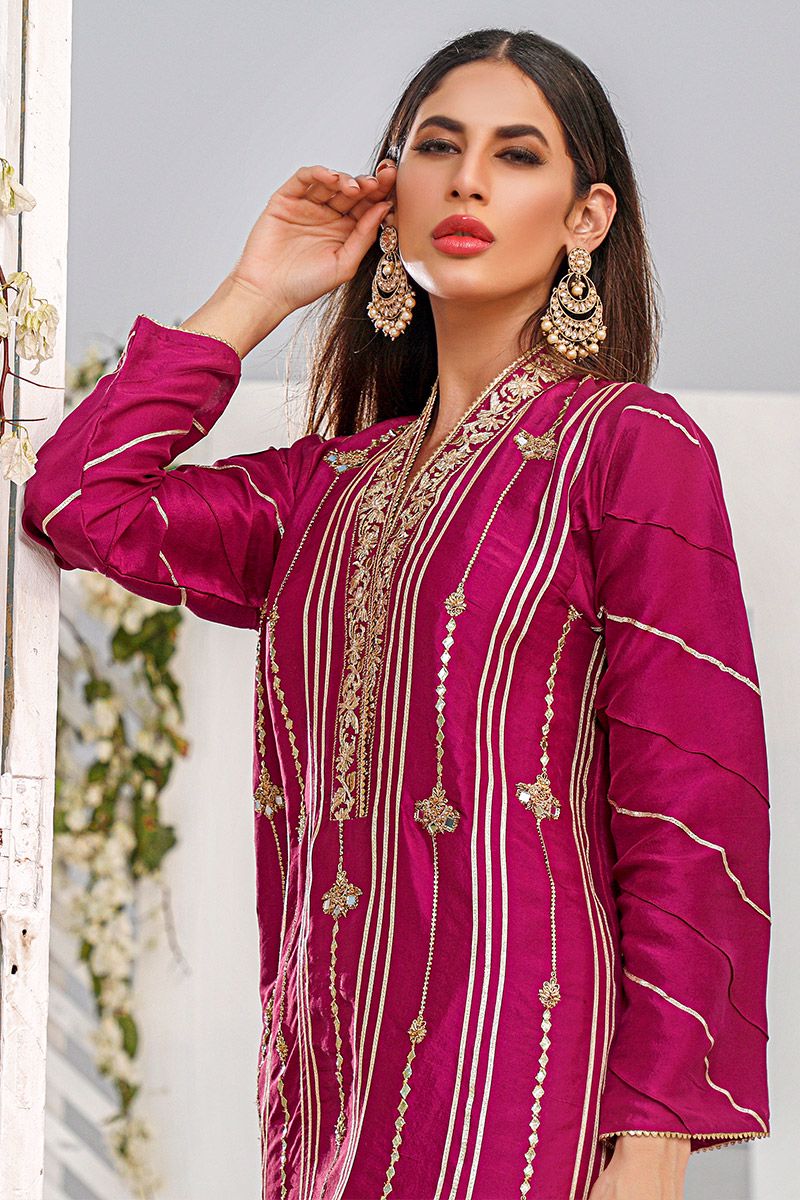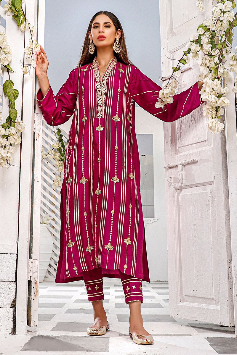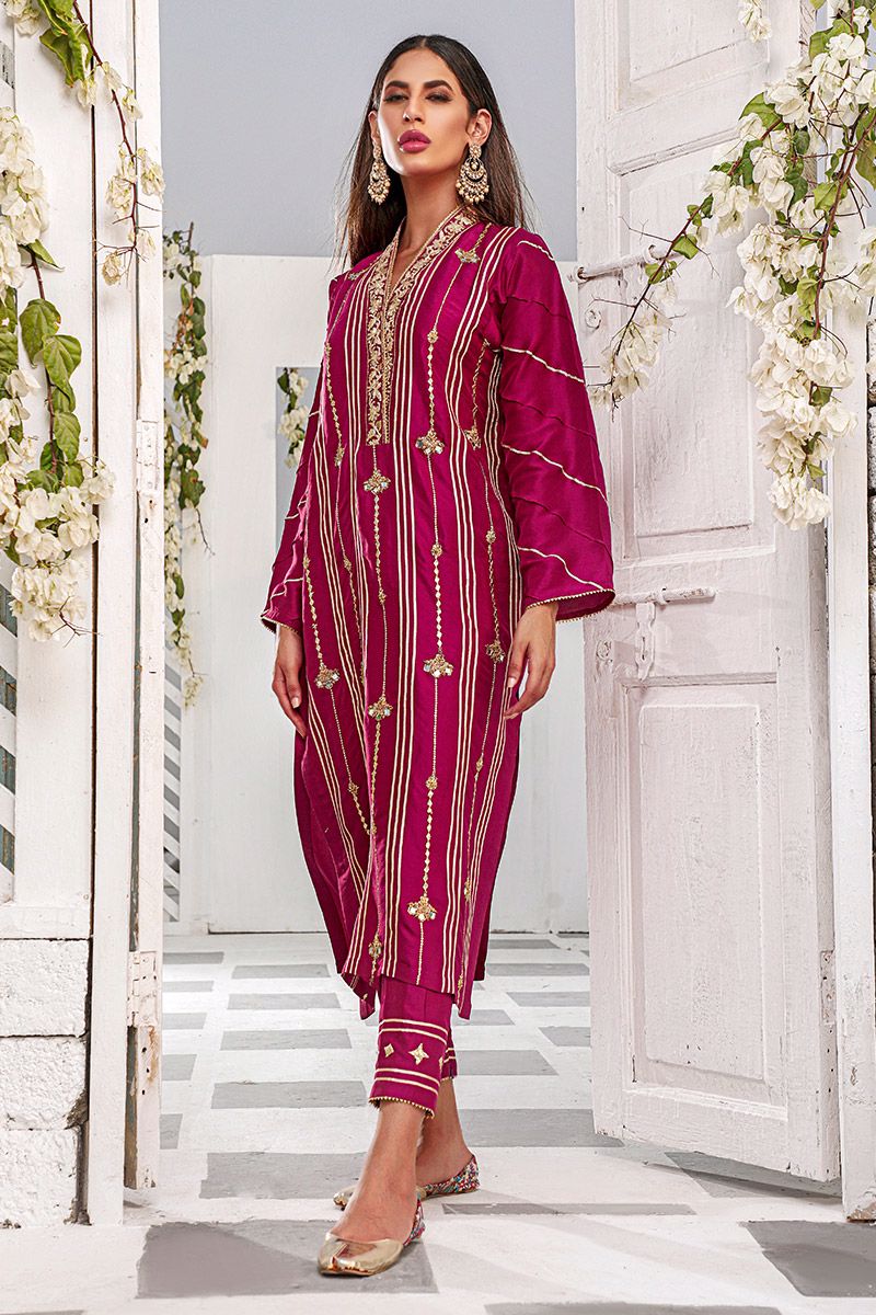 Reviving the ancestral customs, rose red pure raw silk lengthy kurta is assembled with intricate needlework comprising of gota, zardozi, mirror and sequin. The blossoming florals portrays a bold statement complementing with the fauna representation on the sleeves. Same color pure raw silk embellished pants is paired to finish off the look and can be purchased at additional cost