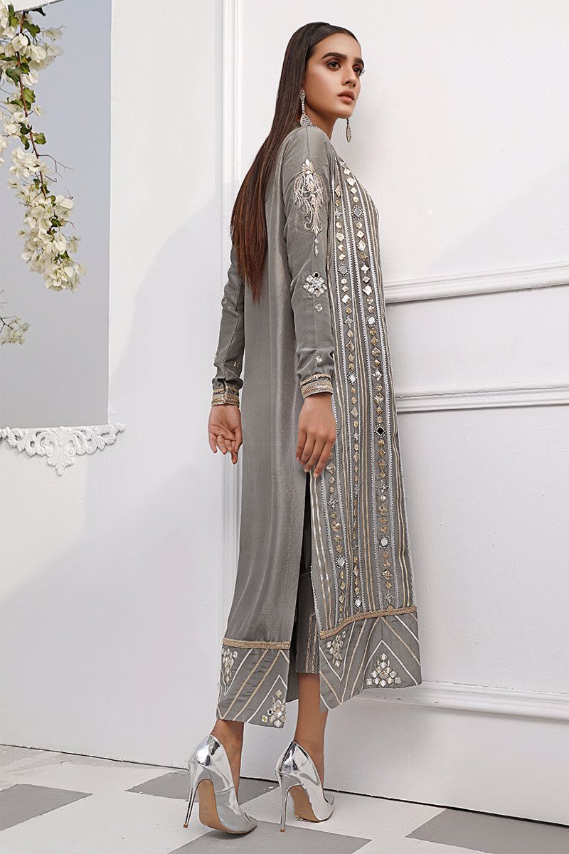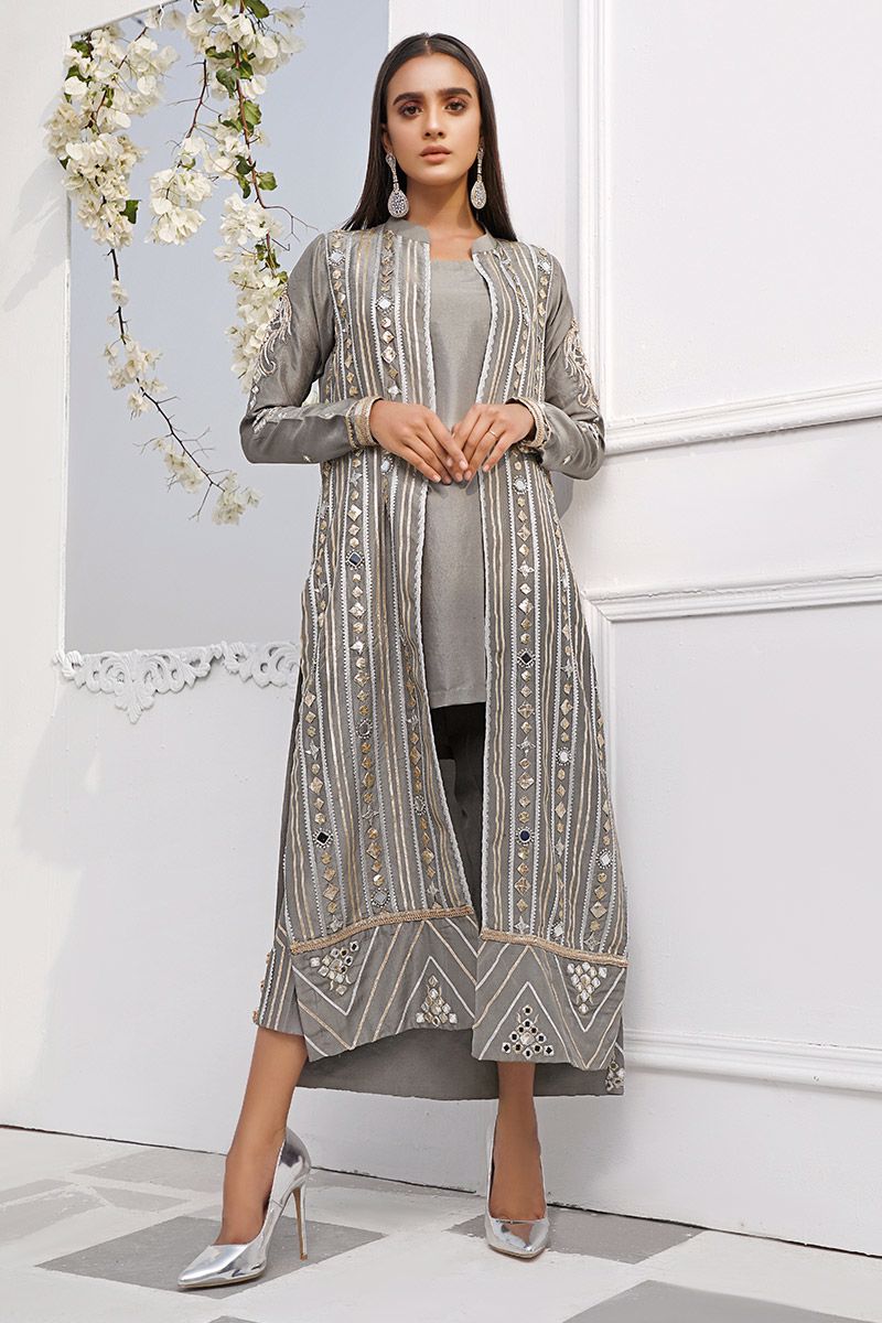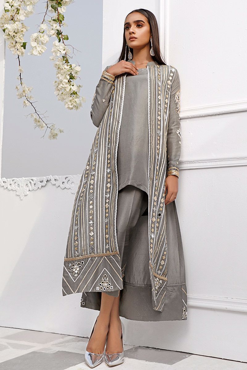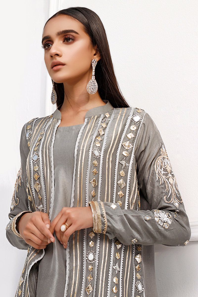 Multi layered ensemble in grey pure raw silk with geometric alignments on the center front panels of the jacket. The embellishments consists of constructive gota and mirror adornments. Work on the sleeves breaks the monotony and brings together a ravishing outfit. Same color pure raw silk straight pants with gota embellishment can be purchased at additional cost.