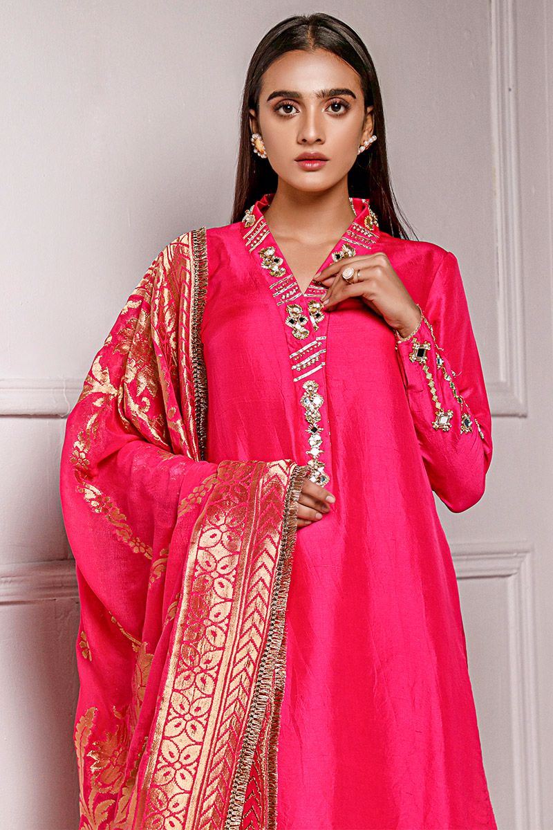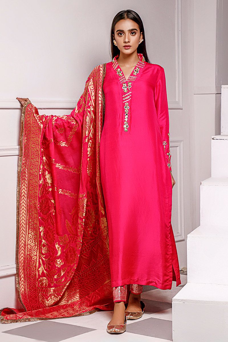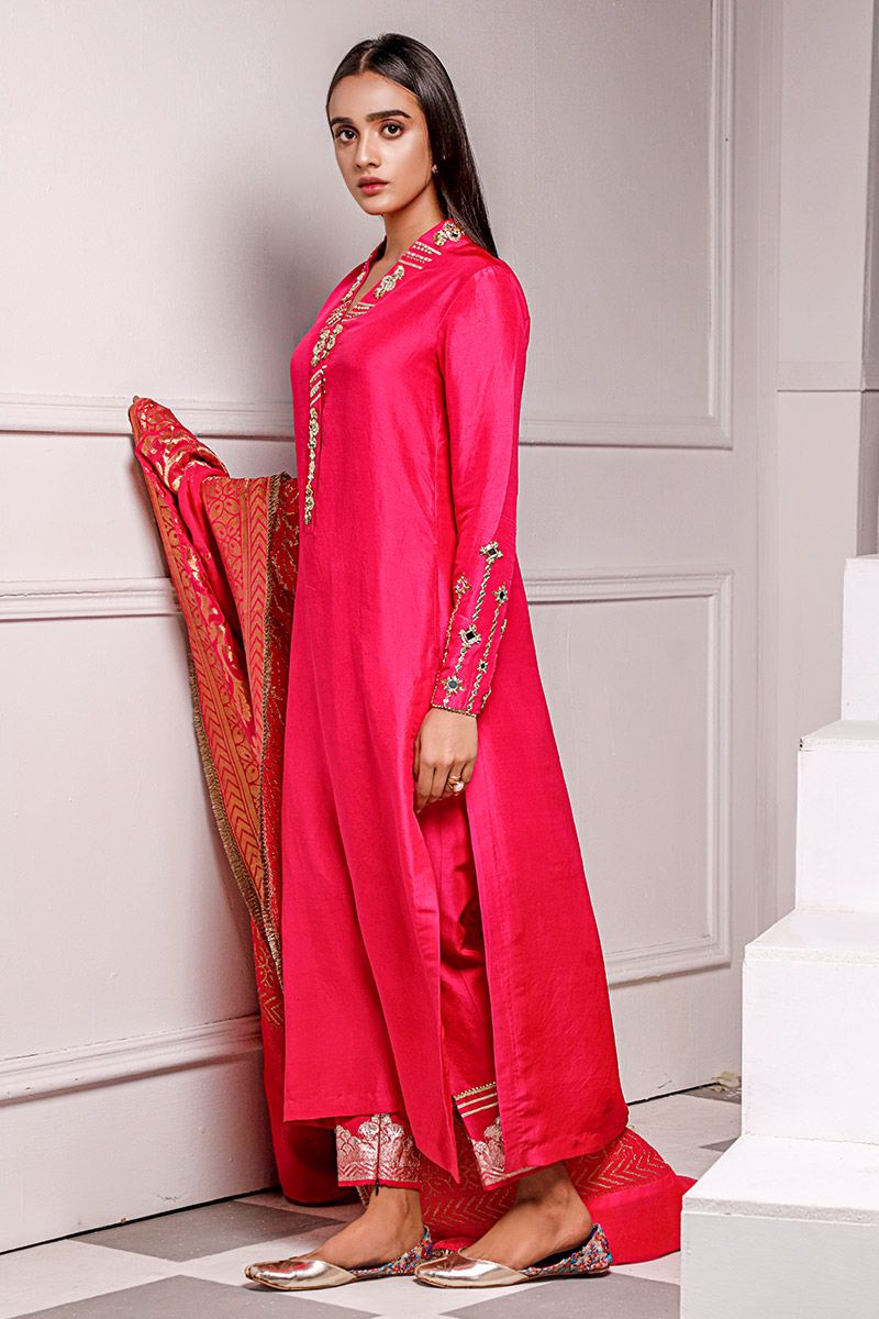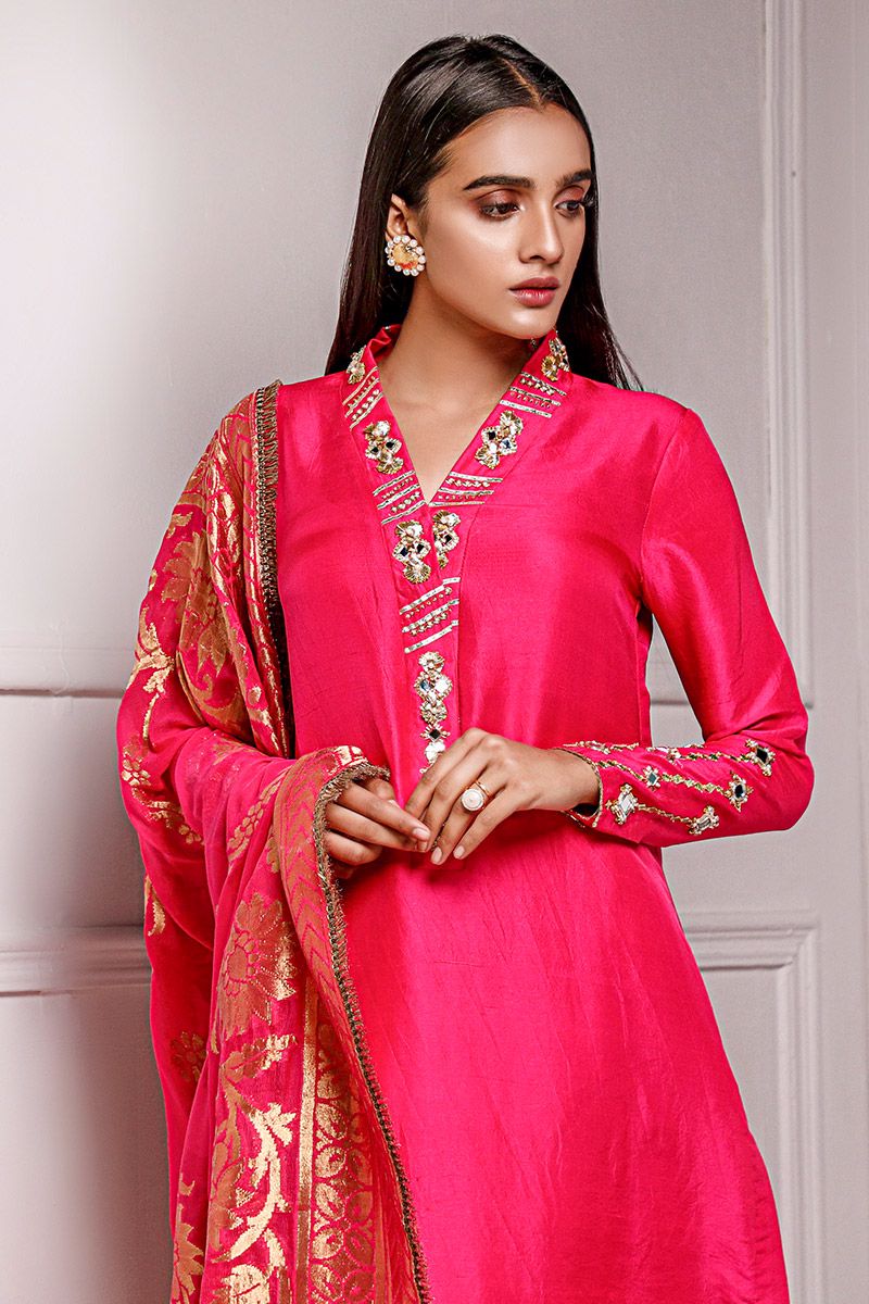 Exquisite design shown in hot pink pure raw silk kurta. The details around the neckline are hand crafted ornaments consisting of gota, pearl, mirror, and cutdana, also contributing towards the edge of the sleeves. To complete the look same color pure raw silk straight pants with fabric manipulation is paired . Hot pink pure chiffon banarsi dupatta uplifts the look and both can be purchased at additional cost.