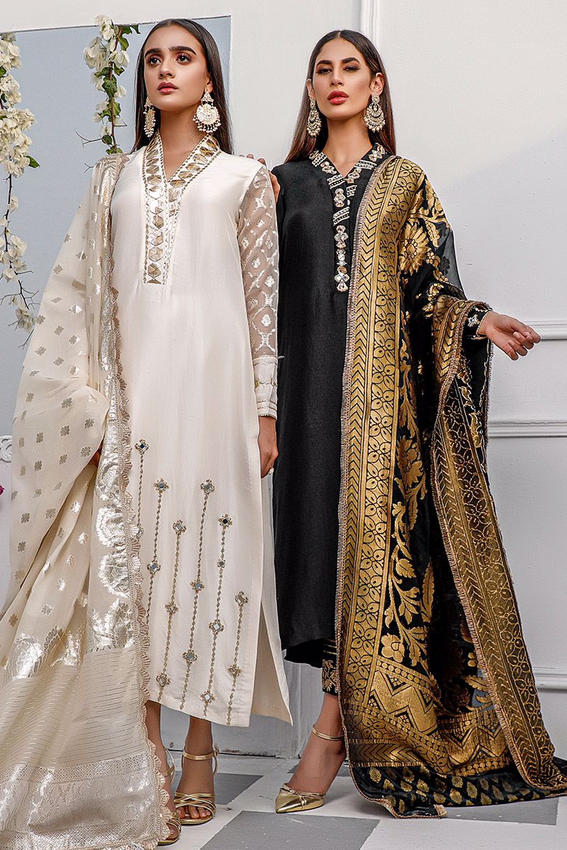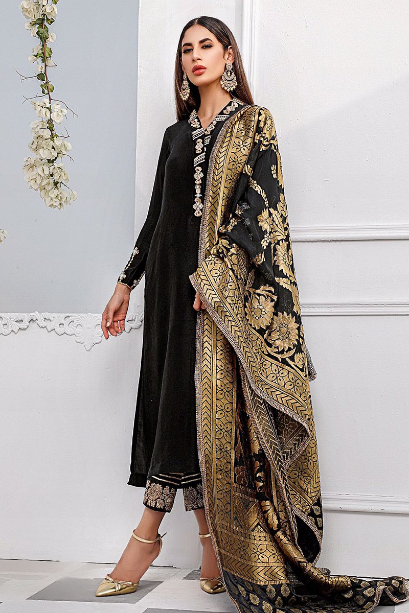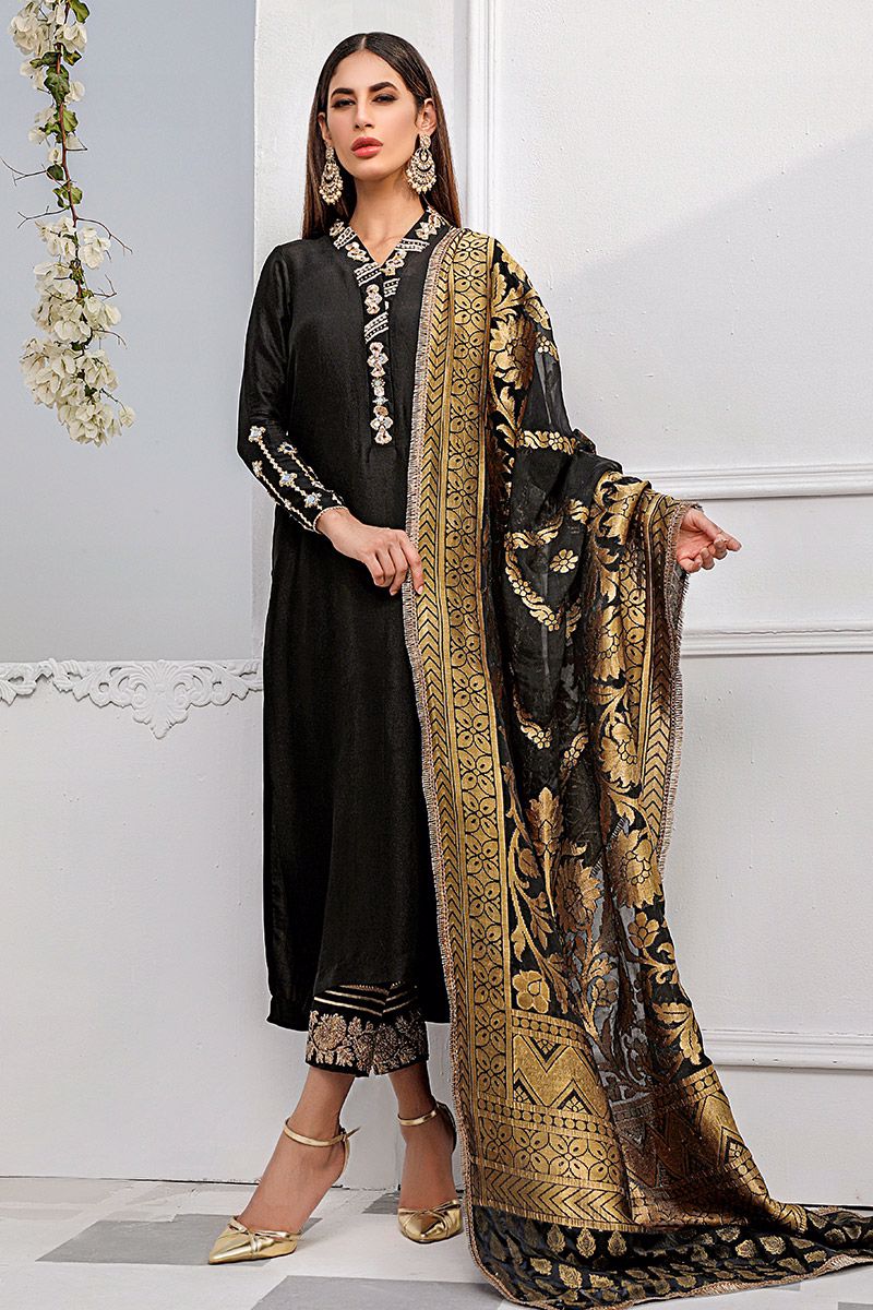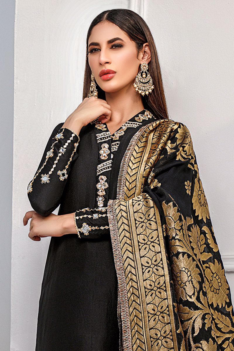 Exquisite design shown in black pure raw silk kurta. The details around the neckline are hand crafted ornaments consisting of gota, pearl, mirror, and cutdana, also contributing towards the edge of the sleeves. To complete the look same color pure raw silk straight pants with fabric manipulation is paired. Black pure chiffon banarsi dupatta uplifts the look and both can be purchased at additional cost.