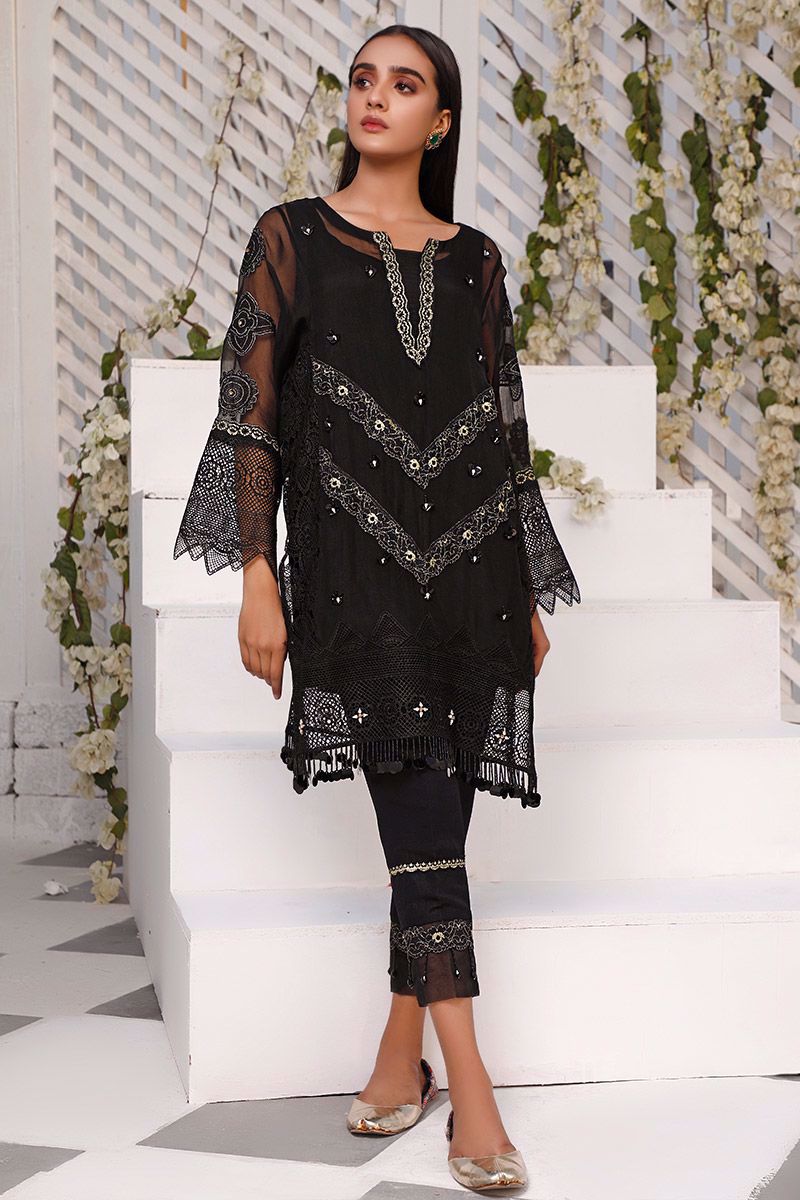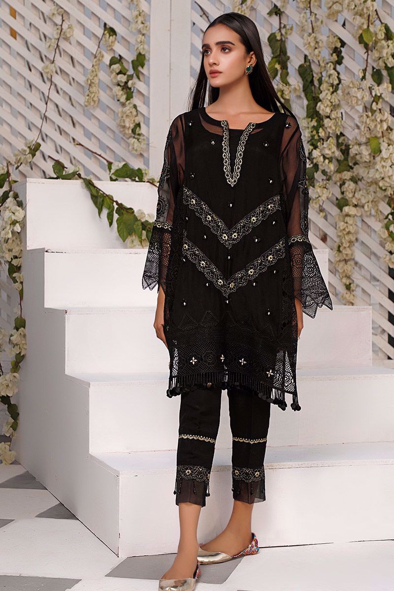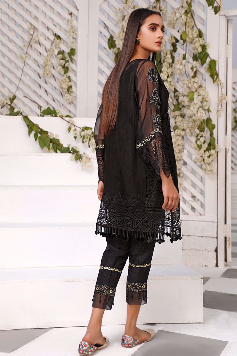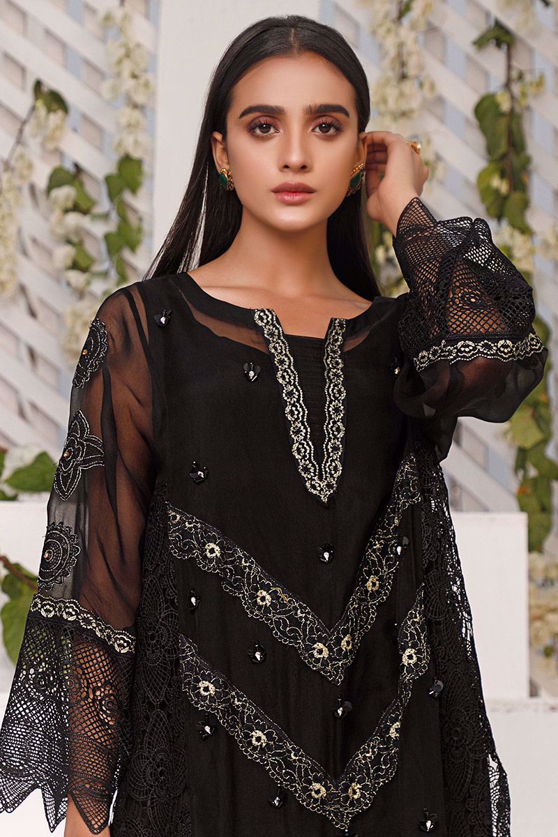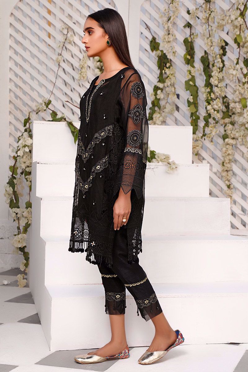 Letting you stand out in the crowd, this exquisite black organza shirt features detailed neckline and intricate motifs consisting of crystals in the center front panel. The crochet panel along with the hemline and sleeves combines the entire piece into alluring shirt. Best paired with semi pure same color decorative straight pants which can be purchased at additional cost